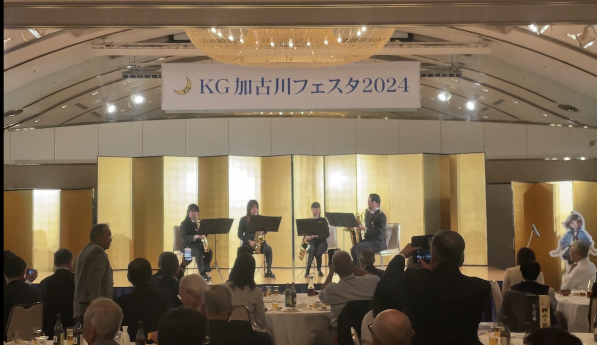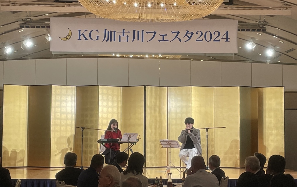 懇親会では、現役学生(ハモネプリーグ2023で優勝したアカペラグループメンバーのヴェンさんとこつめさん)によるデュオ、吹奏楽部のサックス四重奏、